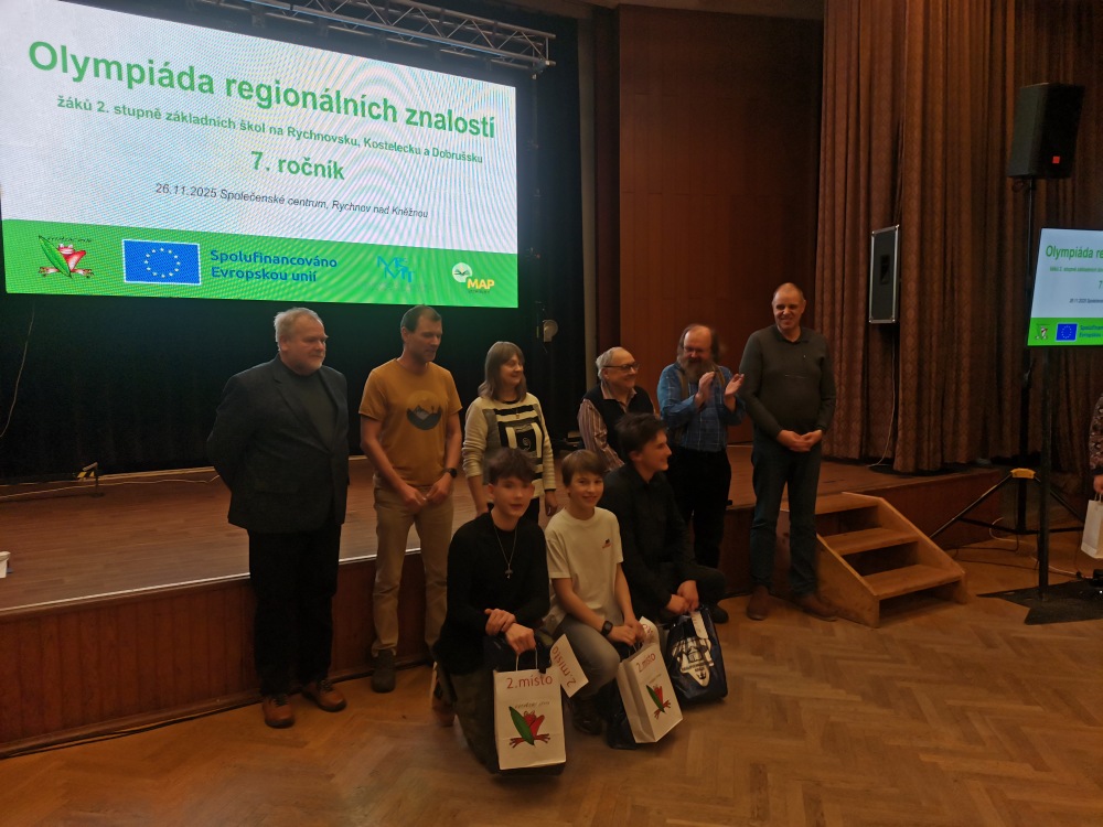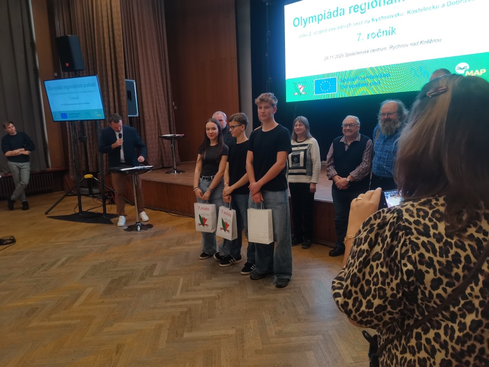 Dnes tým Optimisti ve složení Matyáš Fabián, Jonáš Kuchta a Samuel Vyvlečka z VIII. třídy přivezl stříbro z finále Olympiády regionálních znalostí v Rychnově n. Kn.. Náš další tým Zagorky ve složení Klára Bajerová, Jakub Jansa a Šimon Rücker z IX. třídy obsadil krásné 7. místo. Soutěžící si vyzkoušeli svoje znalosti o našem regionu v kvízových otázkách a předvedli pětiminutový výstup na téma Naše dobro pro ........