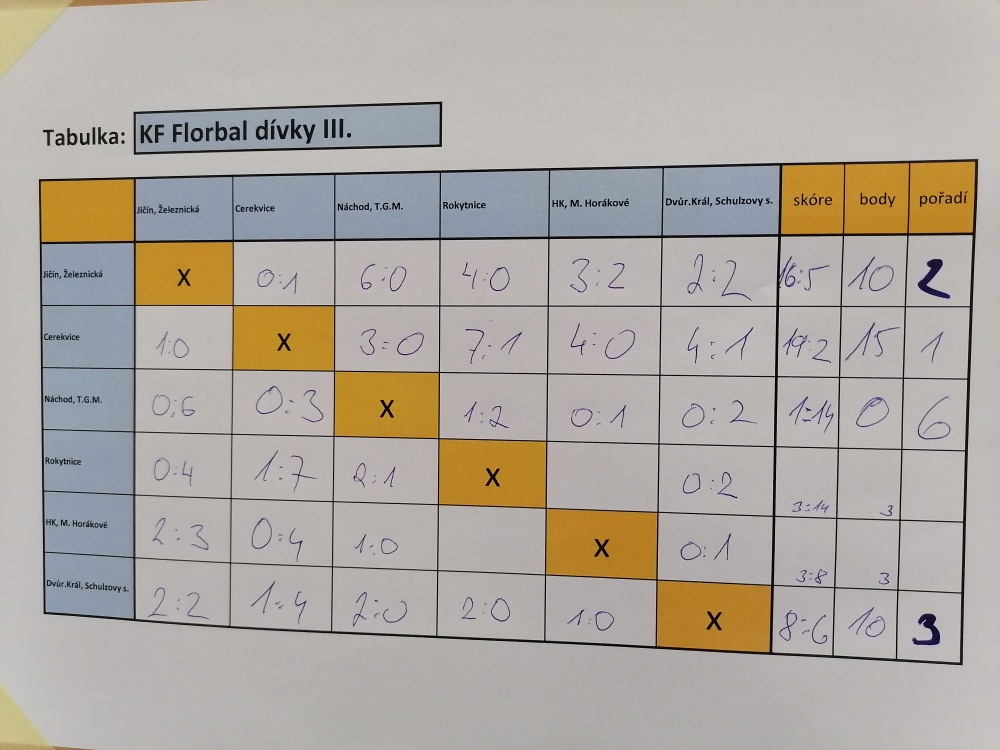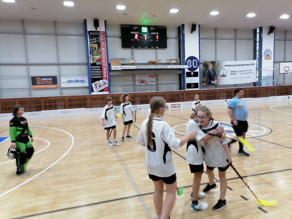 V pátek 28. listopadu naše děvčata vyrazila do Jičína na krajské kolo (kategorie III. dívky) a změřila zde své síly s kvalitnějšími soupeřkami. Po úvodní a zcela zasloužené výhře (2:1) proti Náchodu a počáteční eumforii přišlo postupné vystřízlivění. Poté přišly už jen porážky 0:2 (Dvůr Králové), 0:4 (Jičín), 1:6 (Cerekvice), které ukázaly, jak těžké je se prosadit proti dívkám hrající florbal závodně. Zvláště Cerekvice (která celý turnaj ovládla) potrestala každé naše zaváhání. Ale musím říci, že naše dívky dřely, bojovaly a na palubovce nechaly srdíčko. O trošičku víc proto mrzí i závěrečná těsná porážka 0:1 od Hradce Králové, kde se napřímo bojovalo o čtvrté místo, které by korunovalo samotný úspěch do krajského kola vůbec postoupit. Dívky ukázaly, jaký jsou skvělý kolektiv, jak si náležitě užít postup do kraje a nebýt tam jen tak do počtu. Velké díky brankářce Anetce Potužníkové, Kamče a Nikolce Jirátovým, Barunce Kuchtové, Melanii Holzbach, Elišce Kautové, Johance Michaličkové a Sofče Teplé.