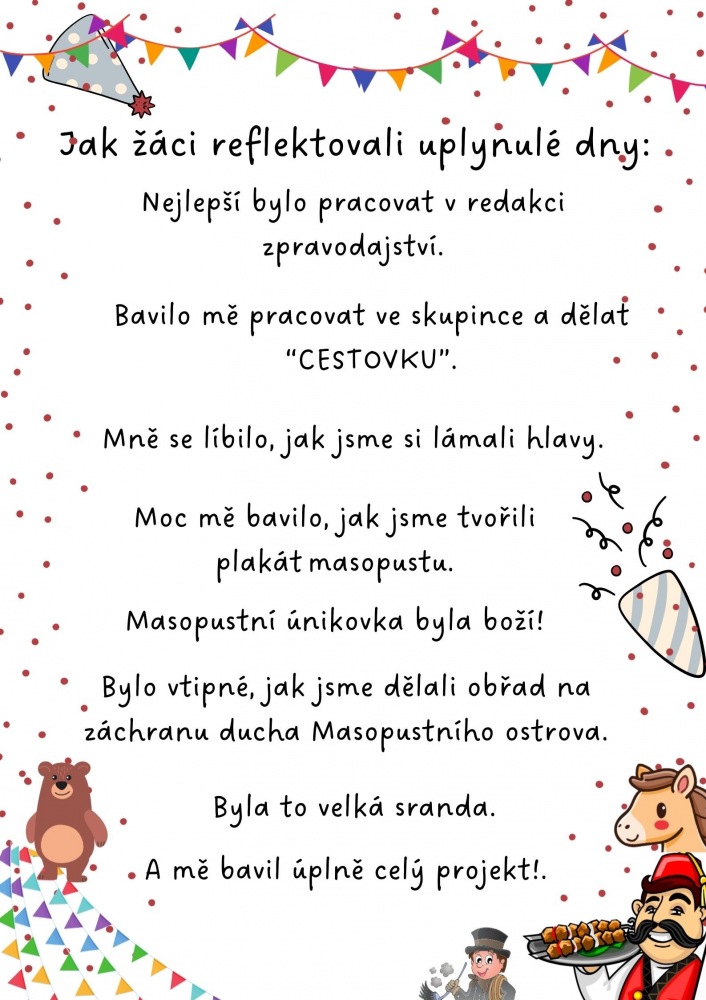 Během projektu žáci pracovali s příběhem a dalšími texty, vyhledávali a zpracovávali informace, řešili matematické úlohy a přemýšleli nad postupy, hráli různé role, tvořili jazykolamy, osmisměrky a novinové články, připravili rozhovor a především se skvěle bavili. Celý projekt krásně propojil čtenářství, matematiku, tvořivost i spolupráci. Děti se dozvěděly mnoho o masopustu u nás i o karnevalech ve světě – a přitom se samy staly jeho aktivní součástí.