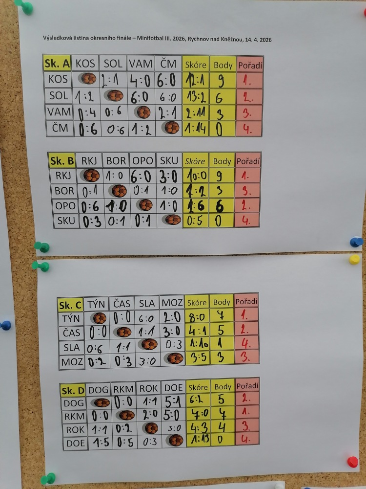 Dne 14. dubna jsme vyrazili s nominovanými na okresní kolo v minifotbale. S trochou štěstíčka jsme mohli pomýšlet na příjemné umístění. Bohužel, jako tým jsme dnes tahali za kratší konec. Po úvodní výhře 3:0 nad ZŠ Dobré přišla smolná remíza s Dobruškou 1:1. V zápase jsme byli o něco málo lepším týmem. Nakonec nás tato ztráta stála druhé místo ve skupině, neboť se Dobrušce podařilo remizovat zápas se ZŠ Masarykova. Ta nás hladce přehrála 0:2 a s přehledem si uhájila prvenství ve skupině.