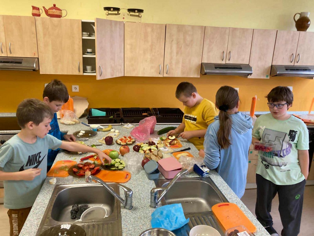 Nakonec jsme ve skupinkách připravovali zdravou svačinku. Krájeli jsme jablka, mazali pečivo sýrem, přidávali salát a všechno hezky aranžovali. Některé skupinky vytvořily jednohubky s plachtami ze sýra. Naše svačinka byla nejen zdravá, ale i moc dobrá. Prostě mňamka. Bavilo nás spolupracovat a učit se něco nového, třeba různé odrůdy jablek a odkud jsou. A všechno jsme to snědli! Bylo to určitě lepší než klasická hodina.