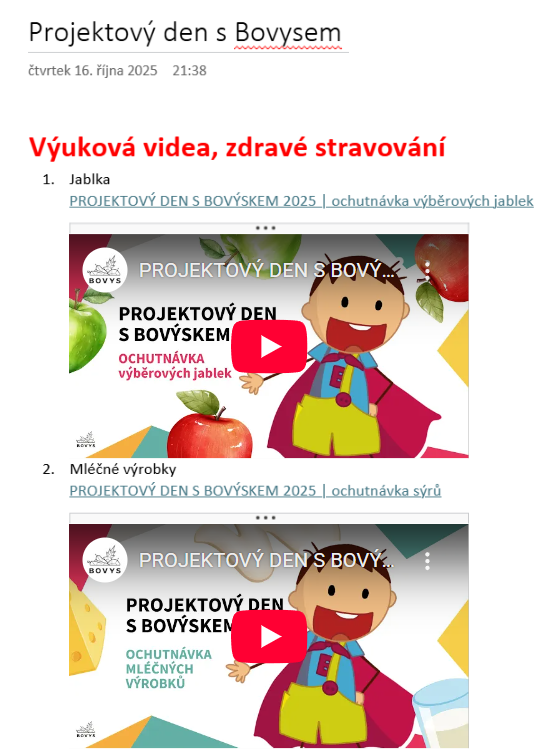 V rámci projektu „Mléko a ovoce do škol“ jsme prožili jeden velmi zajímavý den. Nejdřív se mělo jednat o ochutnávku jablek a sýrů od firmy Bovys. Tato společnost v rámci evropských projektů dodává do škol čerstvé ovoce, zeleninu a mléčné výrobky. Bovys připravil zajímavá vzdělávací videa a k tomu i nějaké pracovní listy. Od toho byl už jen krůček k naplánování celého projektového dne, během kterého jsme se dozvídali různé zajímavosti nejen o jablkách a mléčných výrobcích. Čerpali jsme informace o zdravém stravování, hygienických návycích spojených se stravováním, také jsme se učili o správném způsobu skladování potravin a dozvěděli jsme se pár zajímavých receptů. Třídili jsme získané poznatky, doplňovali jsme je do textu a také jsme kreslili. Jednou z dalších aktivit byly slovní úlohy a výpočty spojené s produkty, které Bovys dětem přivezl. Zlatým hřebem dne pak byla příprava zdravé svačinky spojená s ochutnávkou výběrových jablek a sýrů. Samozřejmě bychom nemohli pokrmy připravit, kdyby si žáci ve skupinkách předem nerozmysleli, co chtějí tvořit a nedonesli by si další potřebné ingredience z domu.