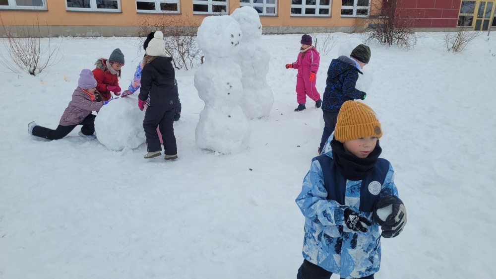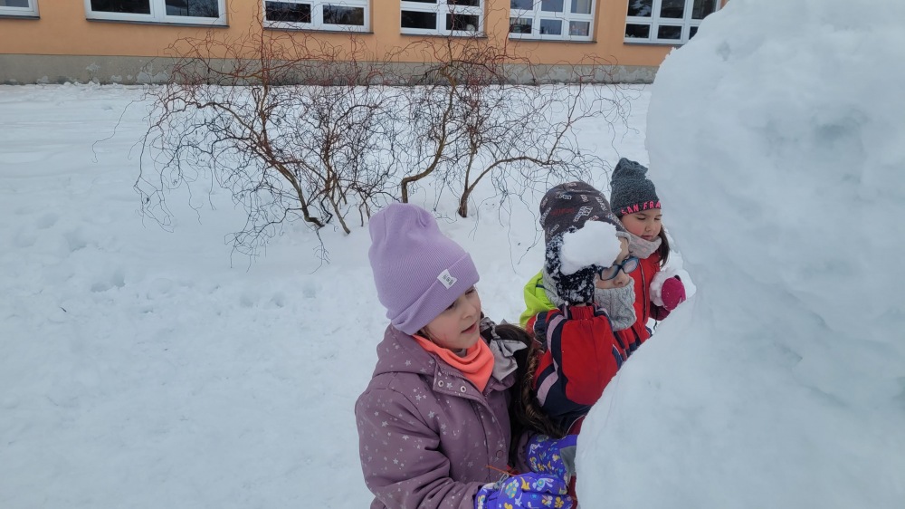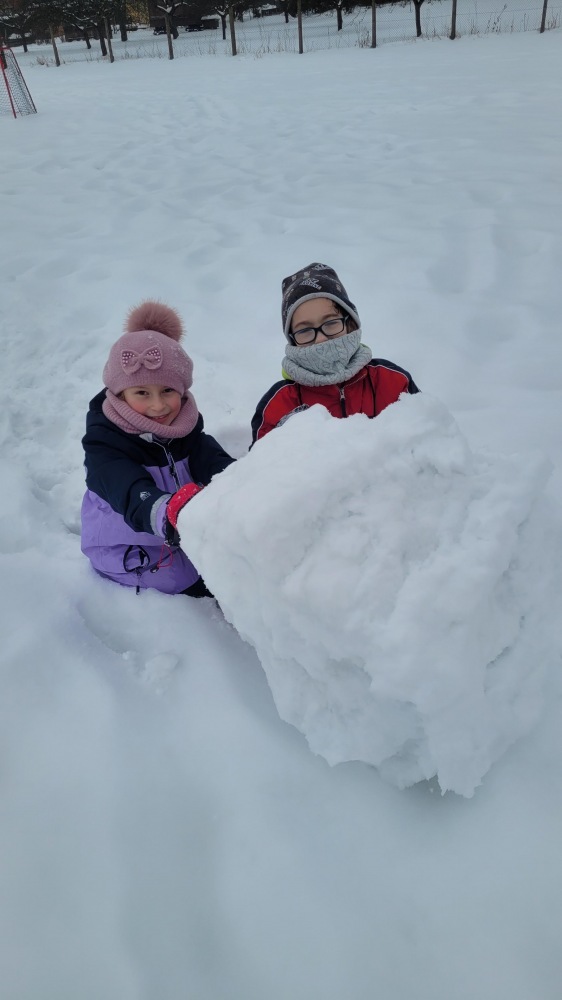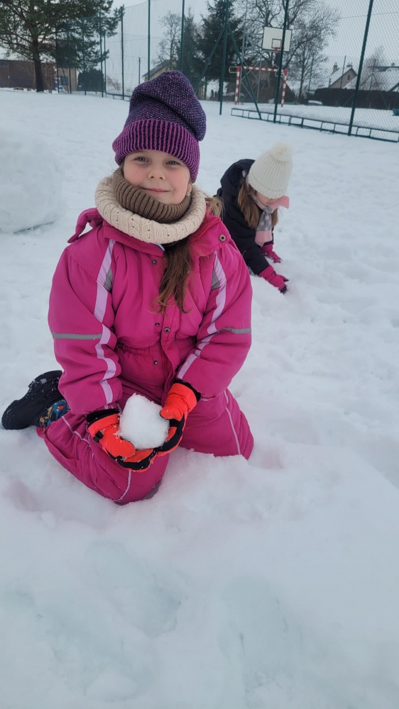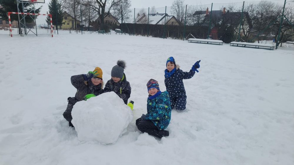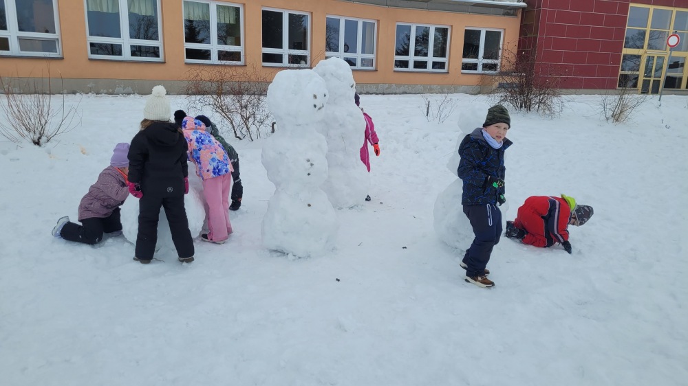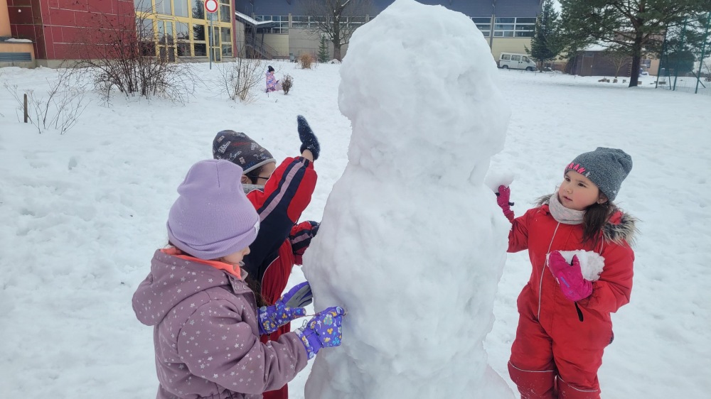 Žáci první třídy v rámci tělesné výchovy stavěli sněhuláky. Sníh lepil báječně. Dostat některé koule nahoru nebo dopravit po zahradě byla opravdová posilovna. Ale nevzdali jsme se a školní zahradu nám hlídají 3 sněhuláci a autíčko.