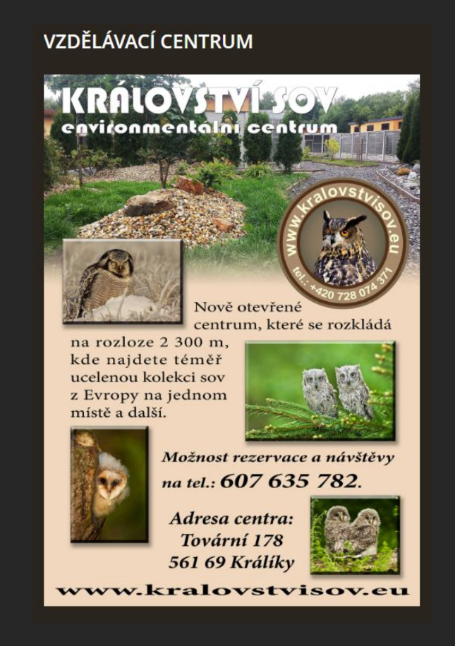 Chovatelé žáky seznámili s několika druhy sov, jež mají ve svém chovu. Děti tak mohly naživo vidět například sovu pálenou, puštíka brýlatého, sovici krahujovou nebo také výra velkého. O všech sovičkách se děti dozvěděly spoustu zajímavých informací, a navíc si poslechly zvuky, které konkrétní druhy sov vydávají. Děti měly také možnost si prohlédnout vajíčka všech 13 druhů sov, které žijí v Evropě. Jako třešničku na dortu pak chovatelé dětem ukázali orla z Kazachstánu, kterého chovají teprve krátce. Program nejen obohatil vědomosti všech účastníků, ale poskytl také inspiraci na zajímavý výlet pro letní období. Mgr. Jana Hovádková, Pavla Michálková, Mgr. Josef Dostál