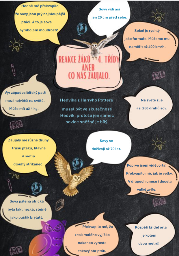 V úterý 18. listopadu se žáci 1. stupně zúčastnili vzdělávacího programu Sovičky, který pro naši školu poskytli chovatelé ze vzdělávacího centra Království sov a papoušků Králíky.